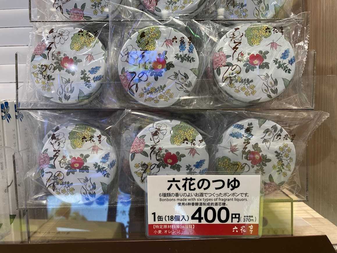 「六花のつゆ」はお砂糖の薄い膜で香り良いお酒を包み込んだ「ボンボン」(18個入りのミニ缶と60個入りがあります)